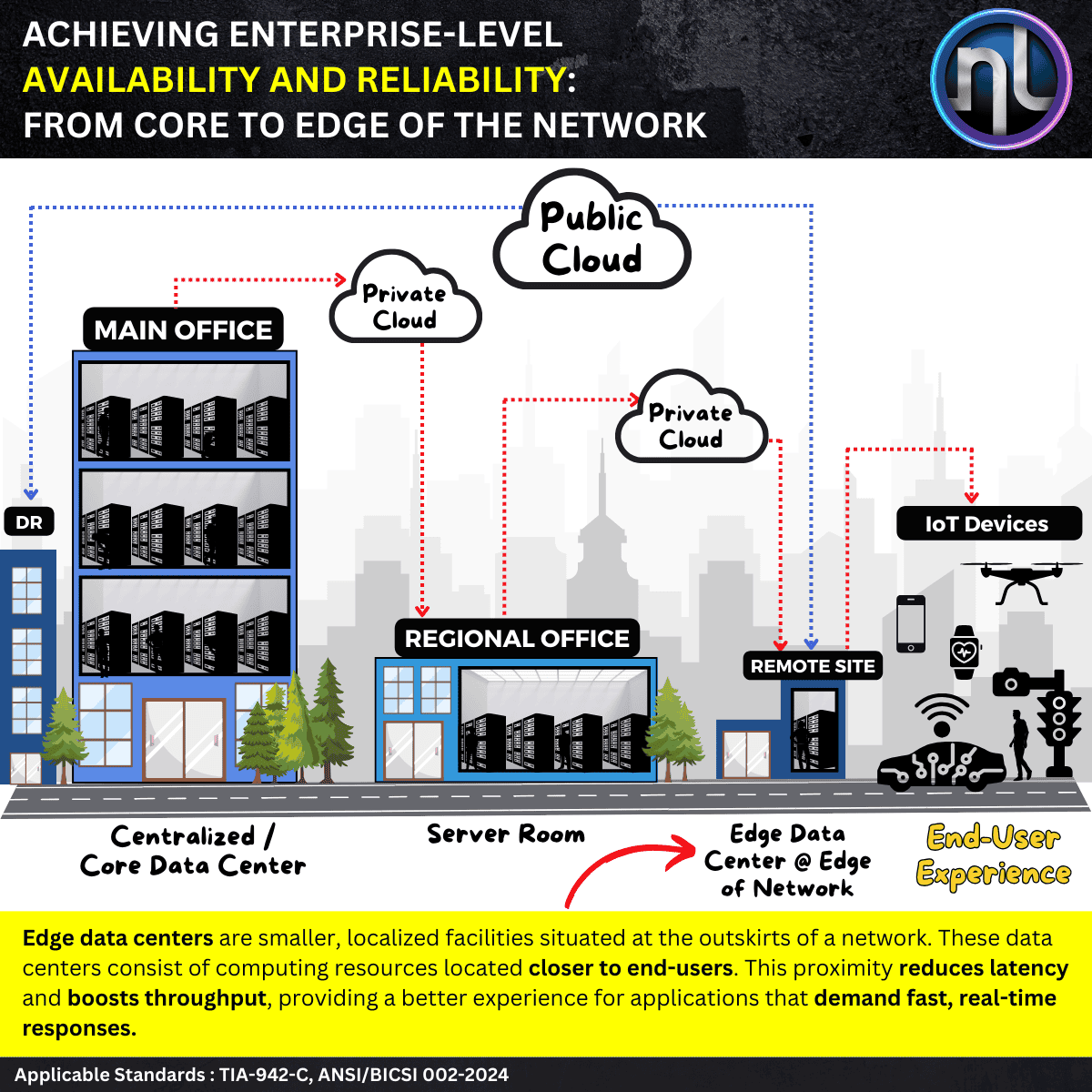 Data Centers | Design Guidelines | Informative Achieving Enterprise-Level Availability and Reliability: From Core to Edge of the Network In today’s hyperconnected world, enterprise networks must deliver high availability, scalability, and real-time performance—from the centralized data center all the way to edge devices. A robust architecture that spans the core, regional, and remote layers of the network is essential to meet these demands. Let’s break down how an optimized architecture ensures enterprise-level reliability across all layers: Centralized / Core Data Center At the center of the architecture sits the main office data center, the digital command hub where the bulk of data processing, analytics, and application hosting takes place. This facility is tightly linked to regional locations through a Private Cloud, ensuring secure, high-speed connections for critical business functions. Regional Offices Server Room The regional office acts as a strategic node that bridges the core and the edge. Equipped with local server rooms, these offices manage traffic distribution, enable local data caching, and facilitate efficient access to applications by nearby remote sites. Remote Sites and Edge Devices From the remote site, data flows to a wide array of IoT devices (Edge Devices), including autonomous vehicles, wearable health devices, mobile phones, drones, and intelligent traffic lights and cameras. This direct connection allows for real-time communication and intelligent decision-making. Disaster Recovery Integration To further enhance reliability, a Disaster Recovery (DR) system is connected to the remote site via the Public Cloud. This integration ensures business continuity and protects vital data, allowing organizations to respond quickly to unexpected disruptions. Key Advantages of This Architecture Faster Service & Greater Bandwidth : Centralized intelligence with distributed processing ensures optimal application performance. Improved Network Reliability : Redundancy and real-time data synchronization minimize the risk of downtime. Cost Efficiency : Optimized cloud integration and edge processing reduce bandwidth and infrastructure overhead. Flexibility and Customization : Each layer can be tailored to match operational requirements, from core to edge. Scalability : Easily add more remote sites, edge devices, or data capacity as your organization grows. SUMMARY An enterprise-grade network that stretches from core to edge isn’t just about connectivity—it’s about creating a resilient, intelligent, and future-ready ecosystem. Whether you’re scaling your operations, embracing edge computing, or tightening your disaster recovery strategy, Northern Link is here to help you design infrastructure that meets your evolving business needs.