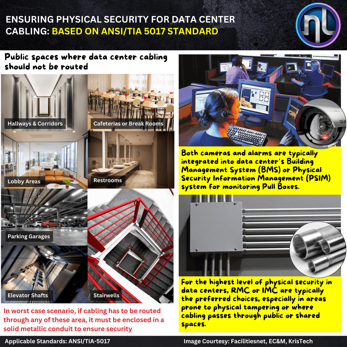 Cables | Data Centers | Design Guidelines | Informative | Structured Cabling Ensuring Physical Security for Data Center Cabling In the evolving landscape of data centers, cybersecurity often takes the spotlight, but physical infrastructure security—especially for structured cabling—is just as vital. Breaches to the physical layer can be just as damaging as digital ones. To address this, the ANSI/TIA 5017 standard outlines best practices and security measures that data centers must adopt to protect telecommunications cabling from unauthorized access, damage, or tampering. Key Highlights from ANSI/TIA 5017 Secure Routing of Cabling Cabling must never be routed through public or tenant-accessible areas unless fully enclosed in secure conduits or locked pathways. Prevents unauthorized physical access Reduces risk of tapping or accidental damage Pull Box Monitoring All pull boxes or cable access points should be monitored via the data center’s security system. Video surveillance and/or Remote alarm systems Ensure real-time response to potential threats or tampering attempts. Use of Solid Metallic Conduits When secure cable pathways can’t be locked or isolated: Install solid metallic conduits or armored raceways Helps maintain the physical integrity of cabling Prevents interference or intentional disruption Why This Matters Implementing these measures not only enhances compliance with industry standards, but also: Reduces the risk of data breaches through physical intrusion. Ensures business continuity by protecting critical communication paths. Bolsters your defense-in-depth security strategy by adding a layer of physical protection Common Risk Areas That Need Attention: Raised floors with open access panels Suspended ceilings with unmonitored cable trays Pull boxes or cable junction points located outside restricted areas Shared cable pathways in multi-tenant buildings Final Takeaway for Data Center Operators Cabling is a key attack surface. Whether you’re designing a new facility or auditing an existing one, aligning with ANSI/TIA 5017 should be a top priority. Northern Link provides consultation and implementation support tailored to meet both performance and security standards.