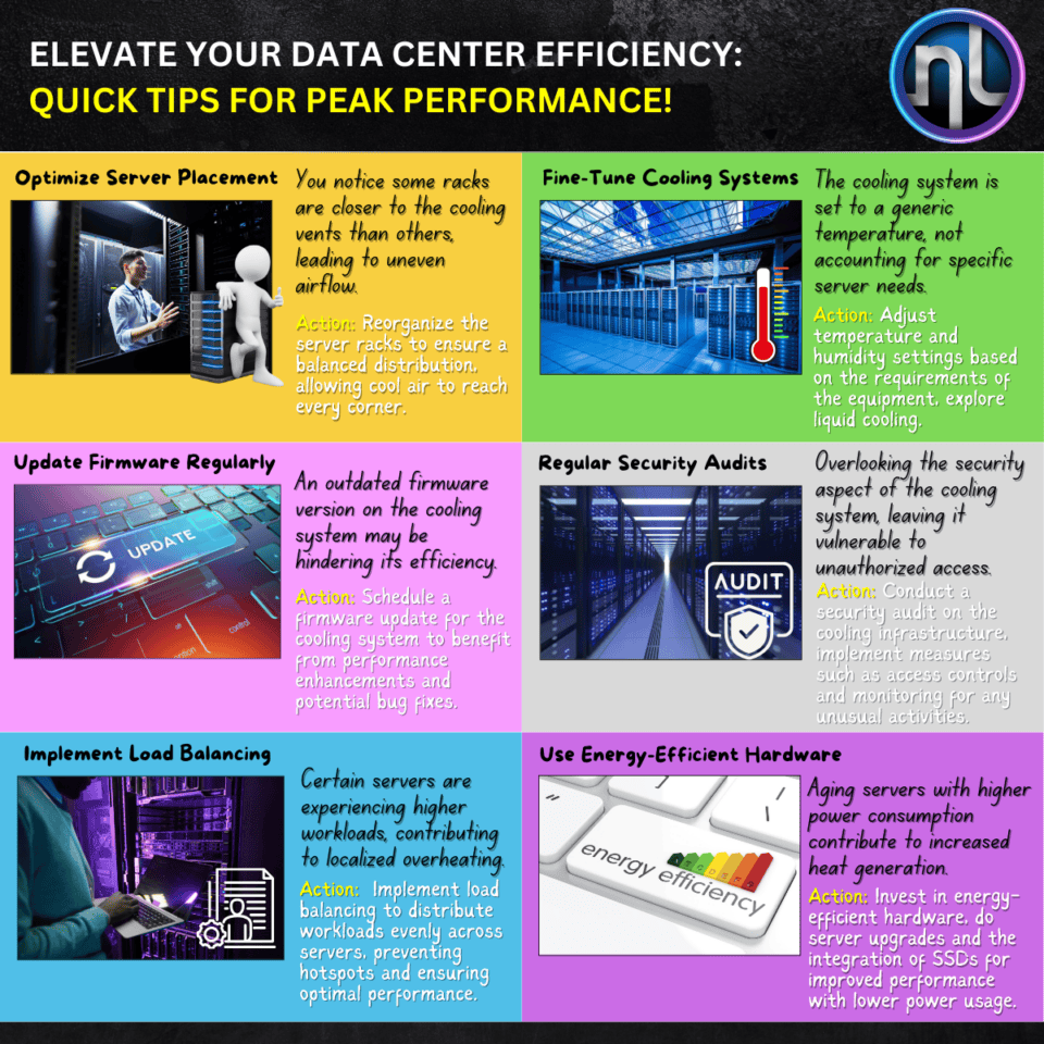 Data Centers | Informative Elevate Your Data Center Efficiency : Quick Tips for Peak Performance Managing a data center is a continuous balancing act between performance, energy efficiency, and operational reliability. If you’ve noticed temperature fluctuations, increased power usage, or performance dips, it may be time to reassess your optimization strategies. Let’s say you’re running a mid-sized data center and your servers are consistently running hotter than usual—this not only affects performance but also raises the risk of hardware failure. The good news? A few proactive measures can go a long way. 6 Practical Tips to Boost Data Center Efficiency 1. Optimize Server Placement Ensure even airflow by organizing racks to support hot-aisle/cold-aisle layout strategies. Avoid blocking vented tiles or overloading racks in specific zones. 2. Update Firmware Regularly Outdated firmware can lead to inefficient power usage and security vulnerabilities. Keep BIOS, firmware, and management software up to date for improved system performance and security. 3. Implement Load Balancing Distribute workloads evenly across servers to prevent hotspots and reduce over-reliance on certain hardware. Virtualization and smart scheduling tools can further enhance efficiency. 4. Fine-Tune Cooling Systems Upgrade to variable-speed fans or AI-based cooling controls. Leverage thermal sensors to monitor real-time temperatures and dynamically adjust cooling output. 5. Conduct Regular Security Audits Strong cybersecurity protocols protect not only data but also uptime. Regularly audit physical and network security systems for vulnerabilities. 6. Use Energy-Efficient Hardware Invest in hardware rated with ENERGY STAR or compliant with 80 PLUS® standards. These reduce power consumption and heat output while maintaining high performance. The Long-Term Payoff By applying these best practices, you’re not just addressing immediate thermal or operational issues—you’re establishing a scalable, energy-efficient foundation for your data center’s future. Efficient data centers mean: Reduced operational costs Improved system reliability Lower environmental impact Extended hardware lifespan Want expert support for optimizing your data center layout, airflow, or equipment selection? The Northern Link team is ready to assist with custom-engineered solutions and standards-compliant designs.