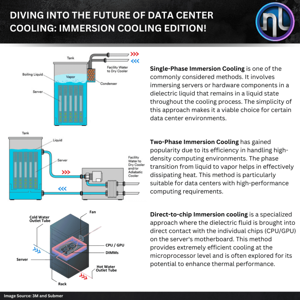 Data Centers | Informative Future of Data Center Cooling: Immersion Cooling The adoption of immersion cooling in data centers is still evolving, and the choice of the immersion cooling system depends on various factors, including the specific needs of the data center, the type of hardware used, and the overall cooling strategy. However, the following three types of immersion cooling systems have gained attention and are being explored for data center applications: 1. Single-Phase Immersion Cooling Servers are fully submerged in a non-conductive liquid that absorbs heat. The liquid remains in liquid form and is cooled externally through a heat exchanger. It’s simple, low-maintenance, and effective for dense computing environments. 2. Two-Phase Immersion Cooling Heat from components causes the liquid to boil and turn into vapor. The vapor rises, condenses on a cooled surface, and returns as liquid. It offers excellent thermal efficiency with a more complex system. 3. Direct-to-Chip Immersion Cooling Coolant is circulated directly to the hottest parts of the chip via cold plates. Only key components are cooled, not the entire system. It’s highly efficient and ideal for targeted, high-performance cooling. While adoption is still evolving, interest is growing fast—especially in AI, HPC, and edge deployments. For deeper insights, keep an eye on recent industry reports, technology vendor updates, and real-world case studies.