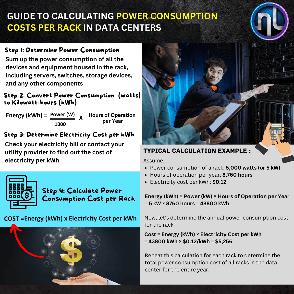 Data Centers | Design Guidelines | Informative Guide to Calculating Power Consumption Costs per Rack in Data Centers Understanding and managing power consumption is crucial for efficient data center operations. Calculating the power cost per rack can help optimize energy usage, reduce expenses, and improve overall sustainability. Step 1: Determine Power Consumption Start by identifying the total power consumption of all equipment in a rack — including servers, switches, storage, and other components. Use: Manufacturer specifications (watts per device) Real-time power monitoring tools for accuracy Step 2: Convert Power to Kilowatt-Hours (kWh) Once you have the power consumption of each rack in watts (W), convert it to kilowatt-hours (kWh), which is the standard unit for measuring electricity usage over time. Formula: (Total Power in Watts ÷ 1000) × Number of Operational Hours per Year Example: A rack using 2000W running 24/7 (2000 ÷ 1000) × (24 × 365) = 17,520 kWh/year Step 3: Determine Electricity Cost per kWh Check your electricity bill or contact your utility provider to find out the cost of electricity per kWh. This rate may vary depending on factors such as location, time of day, and your agreement with the utility provider. Step 4: Calculate Power Consumption Cost per Rack Multiply the energy consumption of each rack in kWh by the cost of electricity per kWh to find the annual power consumption cost for that rack. Formula: Annual kWh × Cost per kWh = Annual Power Cost per Rack Note: Repeat this process for each rack in the data center to determine the annual power consumption cost for all racks. Additional Considerations Cooling Systems: Account for power used by rack-level or room-wide cooling systems Distribution Losses: Factor in any power lost through inefficient power delivery Energy-Efficient Upgrades: Consider the impact of more efficient equipment or power management systems By accurately tracking power consumption per rack, data center operators can make informed decisions about infrastructure upgrades, equipment allocation, and cost-saving strategies — all while supporting greener operations.