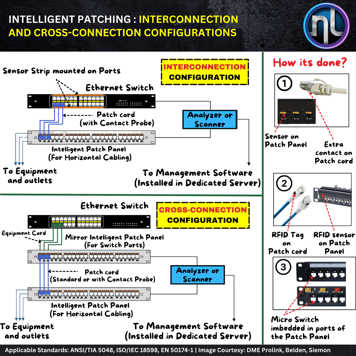 Data Centers | Informative | Structured Cabling Intelligent Patching: Interconnection and Cross-connection Configuration (Automated Infrastructure Management – AIM) As networks scale to accommodate growing digital demands, Intelligent Patching—a key component of Automated Infrastructure Management (AIM)—is transforming how physical layer connectivity is monitored, managed, and maintained. By automating the process of patching (connecting network equipment via patch cords), Intelligent Patching increases operational visibility and accuracy, while reducing manual errors and downtime in mission-critical environments like data centers. What is Intelligent Patching? At its core, intelligent patching automates and monitors patch cord connections between switches, servers, and patch panels. It forms the foundation for real-time tracking of connectivity changes, streamlining Moves, Adds, and Changes (MACs), and providing critical data for network audits and troubleshooting. Intelligent Patching Configurations AIM systems typically support two main configuration models: Interconnection Configuration Utilizes sensor strips on Ethernet Switch ports. Detects direct patch cord connections between the switch and the intelligent patch panel (connected to horizontal cabling). Best for setups needing simple, direct device-to-panel links. Cross-connection Configuration Involves mirroring Ethernet switch ports to an Intelligent Patch Panel. Patch cords link the mirrored panel to another intelligent patch panel handling the horizontal cabling. Ideal for systems using micro-switches or sensors for connection detection—provides more control and documentation flexibility. Current Detection Technologies in Intelligent Patching 9th Pin Sensor ContactA dedicated contact pin on the patch cord interfaces with a sensor on the patch panel for accurate physical connection detection. RFID TechnologyRFID tags embedded in patch cords are detected by sensors on the patch panel, enabling contactless connection identification. Micro-Switch Embedded PortsSmall mechanical switches detect when a cord is inserted or removed, providing instant port activity feedback. Key Benefits of Intelligent Patching Real-Time Monitoring of physical connections between switch and patch panel ports Centralized Database that logs all changes and historical connection data SNMP Integration for seamless communication with network management platforms Automated Work Orders for MAC processes—minimizing manual intervention Faster Troubleshooting & Enhanced Security by knowing exactly what’s connected and where Overall, AIM systems with intelligent patching capabilities streamline the management of interconnection and cross-connection configurations in network infrastructure, improving efficiency, reliability, and agility in IT operations. By automating provisioning, enforcing policies, and providing real-time visibility, AIM systems help organizations optimize their network resources and better adapt to changing business requirements. As part of Northern Link’s commitment to advanced data center infrastructure, we offer solutions compatible with AIM systems for intelligent patching. Whether you’re designing a new network or modernizing an existing one, intelligent patching provides the foundation for future-ready, agile network operations.
