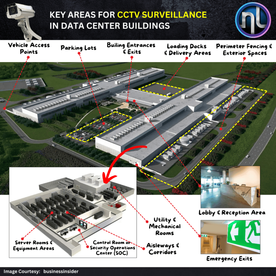 Data Centers | Design Guidelines | Informative Key Areas for CCTV Surveillance in Data Center Buildings CCTV surveillance plays a crucial role in maintaining security and operational efficiency within data center buildings. The protection of sensitive equipment, personnel, and physical assets is essential, and strategically placing cameras in key areas ensures that all security risks are addressed effectively. Below are the key areas within a data center that require comprehensive CCTV surveillance: Parking Lots and Vehicle Access Points Parking lots and vehicle access points are critical locations for surveillance. These areas should be monitored to: Track vehicle traffic entering and exiting the facility. Deter theft, vandalism, or any other unauthorized activities. Enhance perimeter security by observing the flow of vehicles in and out of the area. Building Entrances and Exits Main entrances and exits, both pedestrian and vehicle access points, require CCTV coverage for several reasons: To monitor and verify identities of individuals entering and leaving the building. To detect and respond to unauthorized access attempts or suspicious behavior. To track traffic flow for effective building management and security control. Lobby and Reception Area The lobby and reception area serve as the primary point of entry for visitors and guests. CCTV cameras in these areas help: Monitor visitor traffic. Manage check-in procedures and enhance overall security for personnel and guests. Deter unauthorized access or suspicious activities in the main reception areas. Loading Docks and Delivery Areas Loading docks and delivery areas are essential to monitoring incoming shipments and deliveries: Track goods and equipment being delivered to and from the data center. Prevent theft, tampering, or unauthorized access to shipments. Ensure the safety and security of both the staff and valuable equipment being received. Perimeter Fencing and Exterior Spaces The exterior boundaries of a data center, including perimeter fencing, walls, and surrounding spaces, need surveillance to: Monitor perimeter security and detect any intrusions or breaches. Deter unauthorized access or attempts to enter the facility from the outside Ensure the building’s protection from external threats, including vandalism or forced entry. Server Rooms and Equipment Areas Server rooms, equipment rooms, and data halls house critical infrastructure, making them a high-priority surveillance area: Ensure continuous monitoring of servers, switches, and networking equipment. Track environmental conditions and equipment status. Monitor access control to prevent unauthorized personnel from entering sensitive areas. Control Room or Security Operations Center (SOC) The control room or SOC acts as the central monitoring hub for the entire surveillance system: Requires comprehensive coverage of all critical areas to facilitate real-time monitoring. Assists in incident response and video review to address any security breaches promptly. Helps ensure effective coordination during emergencies or security events. Utility and Mechanical Rooms Utility rooms, mechanical rooms, and electrical distribution areas house vital infrastructure such as HVAC units, electrical panels, and backup generators: CCTV coverage is necessary to monitor equipment operation. Detect failures or malfunctions in crucial systems to ensure the smooth running of the facility. Ensure compliance with safety regulations and prevent unauthorized access to high-risk areas. Aisleways and Corridors Aisleways and corridors between server racks and equipment rows are often overlooked but require monitoring to: Track the movement of personnel and detect any unauthorized access attempts. Identify potential security breaches and ensure the safety of critical infrastructure. Maintain visibility over areas where sensitive data and equipment are physically located. Emergency Exits Emergency exits, stairs, and evacuation routes are essential during an emergency and must be covered by CCTV for the following purposes: Monitor evacuation procedures to ensure safe and efficient exit during emergencies. Identify any hazards that could impact evacuation efforts. Assist emergency responders by providing clear, real-time footage of evacuation routes and activity. By ensuring comprehensive CCTV surveillance coverage across these key areas, data center operators can significantly enhance their security measures, protect valuable assets, and ensure business continuity. These practices not only safeguard the data center infrastructure but also provide peace of mind to stakeholders, ensuring that the facility operates securely and efficiently.