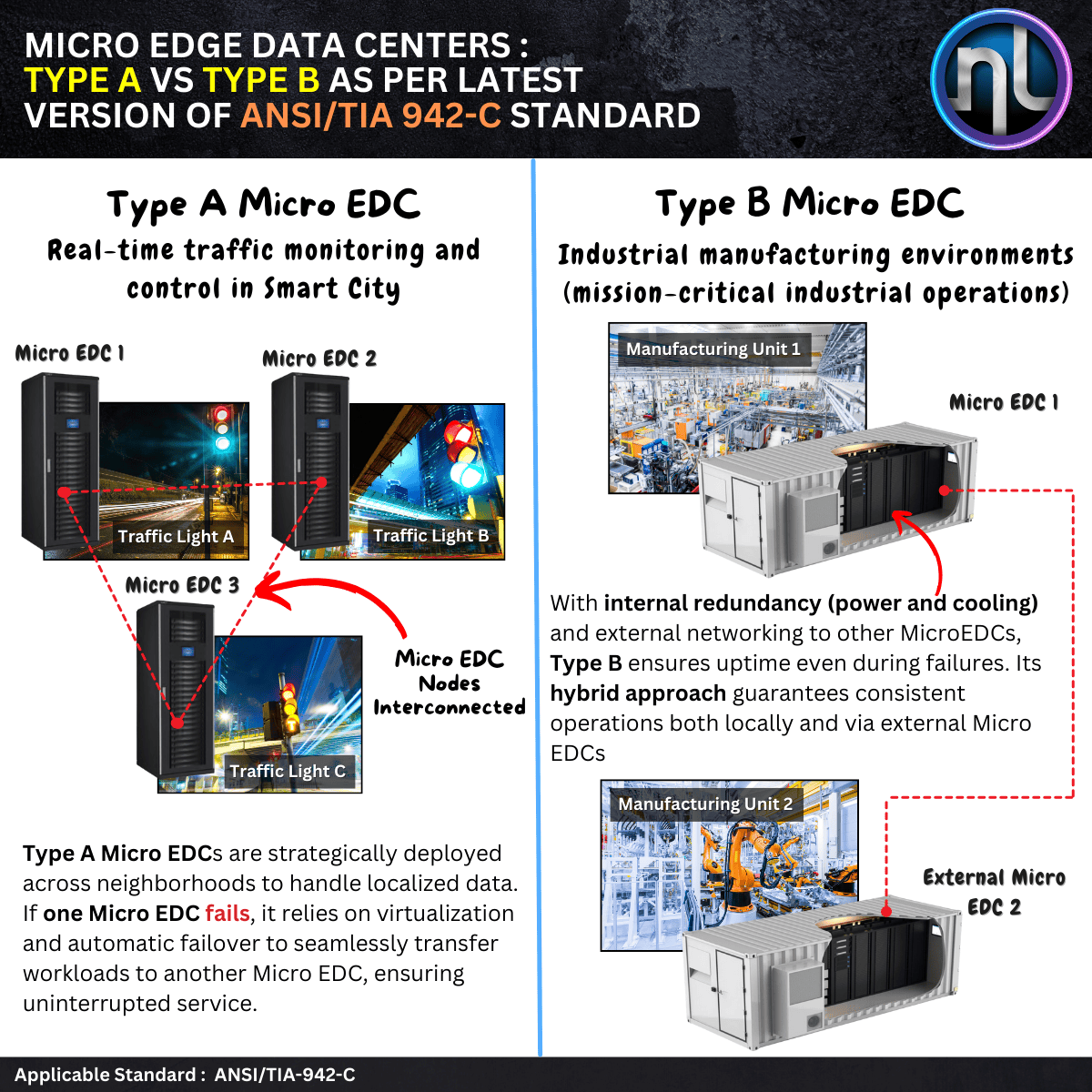 Data Centers | Informative Micro Edge Data Centers: Type A vs. Type B (ANSI/TIA‑942‑C) As edge computing grows, Micro Edge Data Centers (Micro EDCs)—small, modular facilities deployed closer to users and devices—are specified in the latest ANSI/TIA‑942‑C standard. Two primary flavors emerge: Type A Micro EDC Optimized for Smart City & Low‑Latency Applications Use Case : Neighborhood‑level deployments for traffic control, public transit coordination, autonomous vehicles, and real‑time IoT analytics. External High Availability Model : No heavy internal UPS or cooling redundancy—high availability is achieved by virtualization and automatic failover across a network of Micro EDCs. Cost‑Effective : Minimal on‑site infrastructure reduces capex/opex. Low‑Latency : Localized compute keeps service delays under strict thresholds. Resilient via Federation : If one site fails, workloads shift instantly to neighboring Micro EDCs. Type B Micro EDC Designed for Industrial & Mission‑Critical Environments Use Case : Factory automation, robotics, AI‑driven quality control, and environments where localized failures cannot disrupt operations. Internal Redundancy : Built‑in backup power (UPS/generator) and duplicate cooling systems ensure continuous operation on‑site. Hybrid Failover : Retains own redundancy while linking to other Micro EDCs for secondary failover, maximizing uptime. Higher Resilience : Supports mission‑critical loads without relying solely on the network. Flexible Connectivity : Combines local compute reliability with external Micro EDC federation. Choosing Between Type A & Type B CriterionType AType BPrimary Use CaseSmart cities, IoT aggregationIndustrial automation, mission‑criticalInternal HAMinimal (virtual/federated)Full (power & cooling)Cost ProfileLower capex/opexHigher capex, critical for uptimeFailover ModelFederation across Micro EDCsOn‑site + federationLatency FocusUltra‑low, localizedLow, with robust local resilience By aligning your edge strategy with ANSI/TIA‑942‑C’s Type A and Type B definitions, you can deploy Micro EDCs that precisely match application demands—whether city‑wide IoT or factory‑floor reliability.
