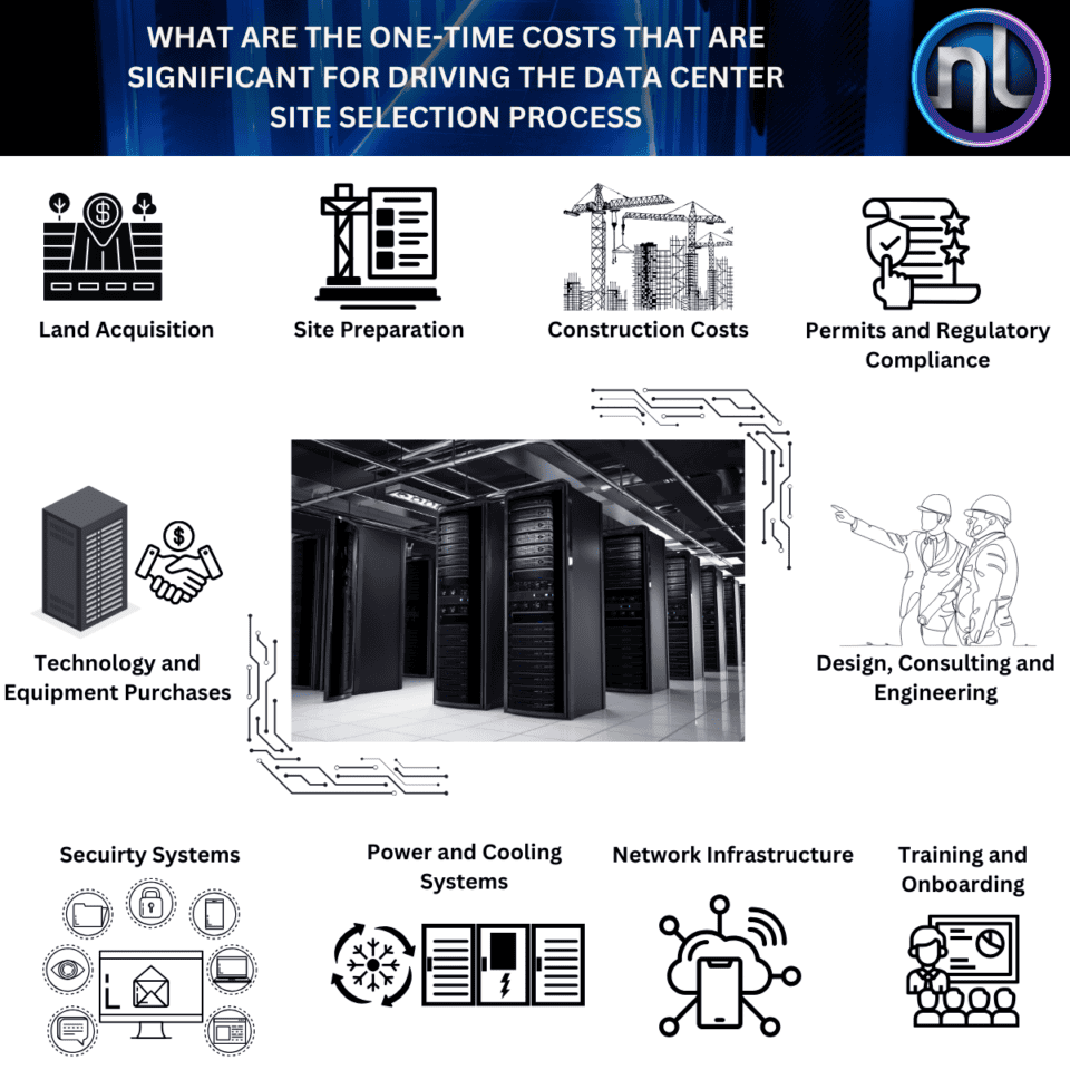 Data Centers | Informative One-Time Expenses That Shape Data Center Location Land Acquisition The cost of purchasing or leasing the land where the data center will be located. Site Preparation Costs associated with clearing, grading, and preparing the selected site for construction. Construction Costs Expenses related to the actual construction of the data center facility, including building structures and outfitting the facility with necessary equipment. Permits and Regulatory Compliance Costs associated with obtaining permits for construction and ensuring compliance with local regulations and building codes. Design, Consulting and Engineering Fees for architects, engineers, and consultants involved in the design and planning of the data center. Technology and Equipment Purchases Expenses related to acquiring technology infrastructure, such as servers, networking hardware, and storage systems. Security Systems Costs associated with implementing security measures, including access control systems, surveillance cameras, and other security infrastructure. Power and Cooling Systems Expenses related to the installation of power distribution systems, backup generators, and cooling systems to support the data center’s operational needs. Network Infrastructure Costs associated with setting up the network infrastructure, including routers, switches, and cabling. Training and Onboarding Expenses related to training personnel on technologies, processes, and security protocols associated with the data center. These are the one-time costs encompass various aspects of the data center site selection and construction process. Proper budgeting and management of these costs are essential to ensure a successful and efficient data center project. Additionally, considering contingency funds for unforeseen expenses is advisable to mitigate risks and avoid budget overruns.