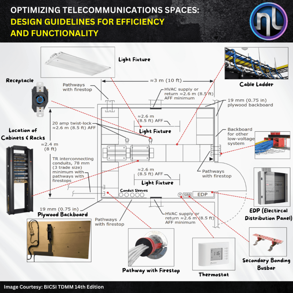 Design Guidelines | Informative | Telecommunication Spaces Optimizing Telecommunications Spaces : Sizing & Design Guidelines for Efficiency Telecommunications spaces are the backbone of structured cabling systems in commercial buildings. Proper sizing and layout are critical for functionality, maintenance, and scalability. Here’s a practical guide based on international standards to help you design efficient and standards-compliant telecom spaces. Recommended Room Size Based on Area Served If serving ≤ 460 sq. meters (5,000 sq. ft), then Size: 3m (10 ft) x 2.4m (8 ft) Allows center placement of racks, cabinets, or enclosures. If serving > 460 and ≤ 740 sq. meters (5,000–8,000 sq. ft), then Size: 3m (10 ft) x 2.74m (9 ft) If serving > 740 and ≤ 929 sq. meters (8,000–10,000 sq. ft), then Size: 3m (10 ft) x 3.4m (11 ft) Key Design Considerations for Telecommunications Spaces Ceiling Height Minimum : 2.4m (8 ft) above finished floor (AFF) Recommended : 3m (10 ft) Equipment Clearance Front & Rear of Rack : Minimum 1m (3.28 ft) Sides of Rack (especially in corners) : Minimum 300mm (12 in) Wall-Mounted Equipment Access Minimum 1m (3.28 ft) clearance for installation and maintenance. Conduits & Trays from Ceiling Should extend into the room 25.4mm – 51mm (1–2 in) without bends End height : 2.4m (8 ft) AFF. Backboard Installation Plywood should be painted with two coats of fire-retardant, light-colored paint on all sides. Rack Footprint Recommended per rack : 1m (3.28 ft) width x 1m depth x 2.3m (7.5 ft) height Environmental & Lighting Recommendations If passive space (no active equipment) Temperature: 10–35ºC Humidity: ≤ 85% RH If active equipment present: Temperature: 18–24ºC Humidity: 30–55% RH Lighting Requirements: Minimum: 500 lux (50 foot-candles) at termination points Fixture height: Minimum 2.6m (8.5 ft) AFF Proper planning of telecommunications spaces ensures not only code compliance and safety but also makes future expansions, equipment access, and thermal management easier. Whether you’re building new or retrofitting, these guidelines provide a strong foundation for robust ICT infrastructure.