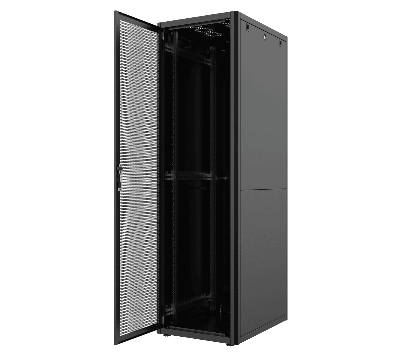 The DataVault Floor-Standing Rack is a versatile enclosure tailored for efficient airflow and secure equipment housing. Featuring a single perforated front door with 63% open area for superior ventilation and a solid metal rear door for added security, this rack is ideal for IT and networking applications in data centers and commercial setups.