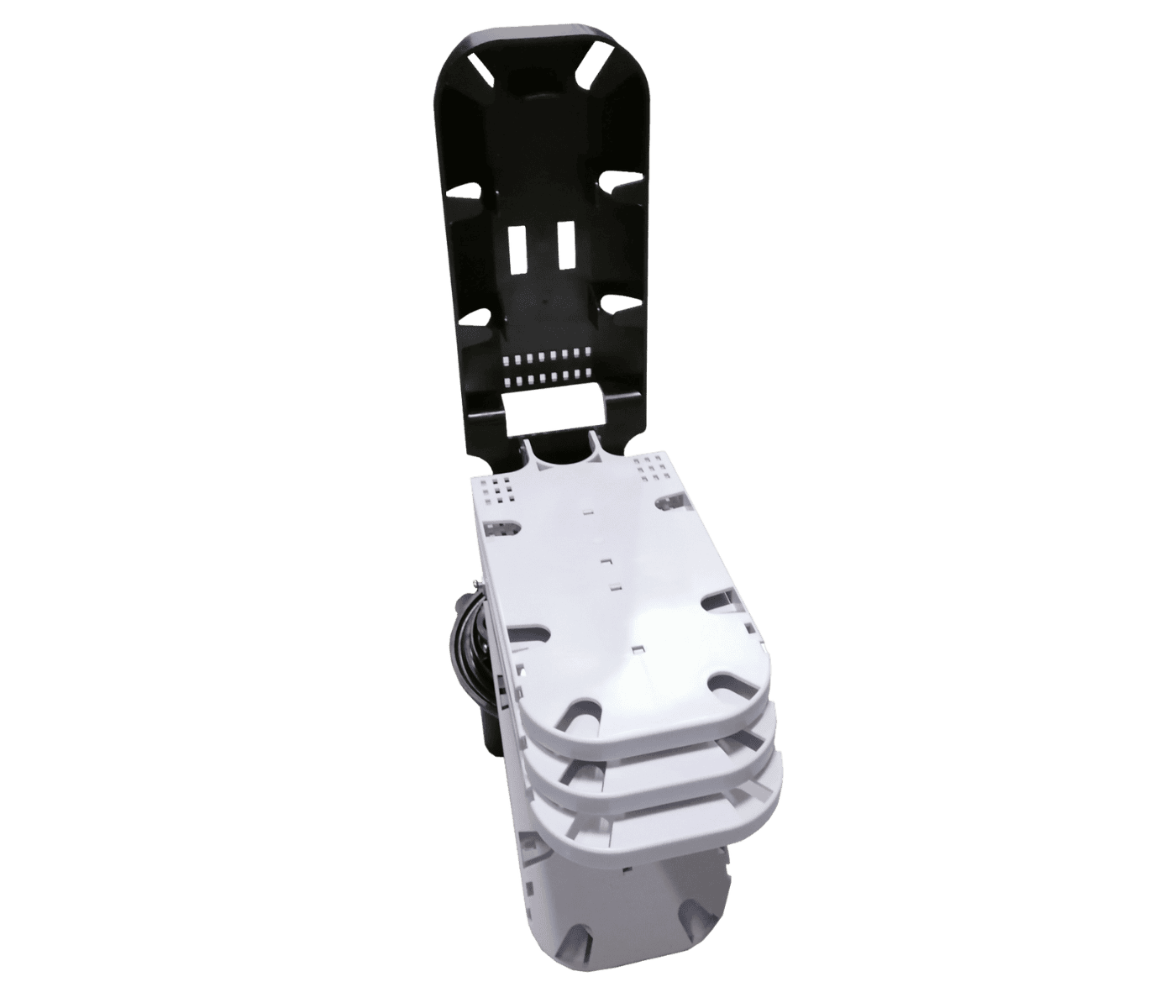 The DomeFOSE Dome Fiber Optic Splice Enclosure is designed for superior fiber protection and management in aerial, underground, and pole-mount applications. With a 576-fiber splice capacity, this enclosure ensures secure fiber splicing while maintaining network reliability and long-term performance. Crafted from a durable ABS+PC blend, the DomeFOSE enclosure offers high impact resistance, UV protection, and excellent sealing performance against environmental factors. Its heat shrink sealing method guarantees a reliable and watertight closure, making it ideal for harsh outdoor conditions. This enclosure features 4 round and 1 oval port, allowing for flexible cable entry configurations and easy fiber management. The stackable splice tray design enhances accessibility while optimizing fiber organization and maintenance. This model is equipped with 4 specialized splice trays, each designed to hold 12 ribbon heat shrinkable sleeves. With each tray supporting 144 fibers (12 x 12F ribbon splices), the total enclosure capacity reaches 576 fibers, making it an ideal choice for high-density fiber networks.