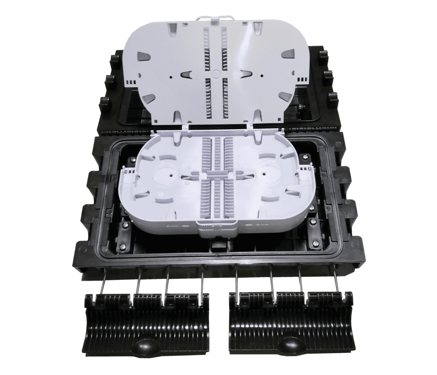 The InFOSE Inline Fiber Optic Splice Enclosure is a compact and durable fiber management solution designed for fiber splicing and cable protection in harsh outdoor environments. Constructed from high-quality PP plastic, it ensures superior impact resistance, lightweight durability, and long-term reliability. The enclosure features 6 cable ports (3 in, 3 out), including 4 ports (Ø8mm) and 2 ports (Ø13mm), providing flexible cable management options. A silicone gasket seal between the cover and bottom ensures IP65-rated waterproof and dustproof protection, making it suitable for aerial hanging installations. Equipped with 4 splice trays supporting up to 24 fibers per tray, this enclosure can accommodate a total capacity of 96 fiber splices, making it an efficient and cost-effective choice for fiber distribution networks.