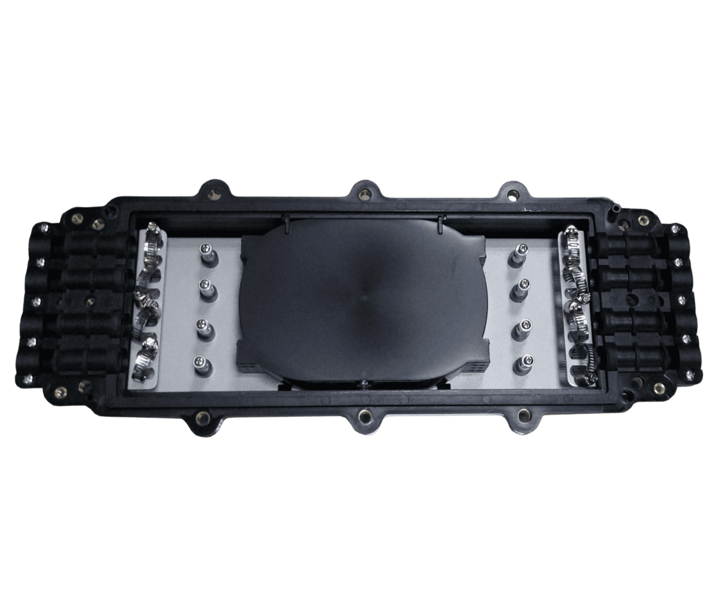The InFOSE Inline Fiber Optic Splice Enclosure is designed for secure fiber optic splicing, protection, and cable distribution in outdoor environments. Constructed from high-quality ABS plastic, it offers durability, impact resistance, and environmental protection. Equipped with 8 in-out round ports, this enclosure supports fiber cable diameters ranging from Ф8mm to Ф16mm. It accommodates up to 144 fibers with 6 splice trays (24F per tray). The mechanical sealing system, filled with silicone rubber insulation tape, ensures a reliable, reusable, and weather-resistant closure. Ideal for aerial and wall-mounted installations, this enclosure is suitable for FTTH, access networks, and backbone fiber infrastructure.