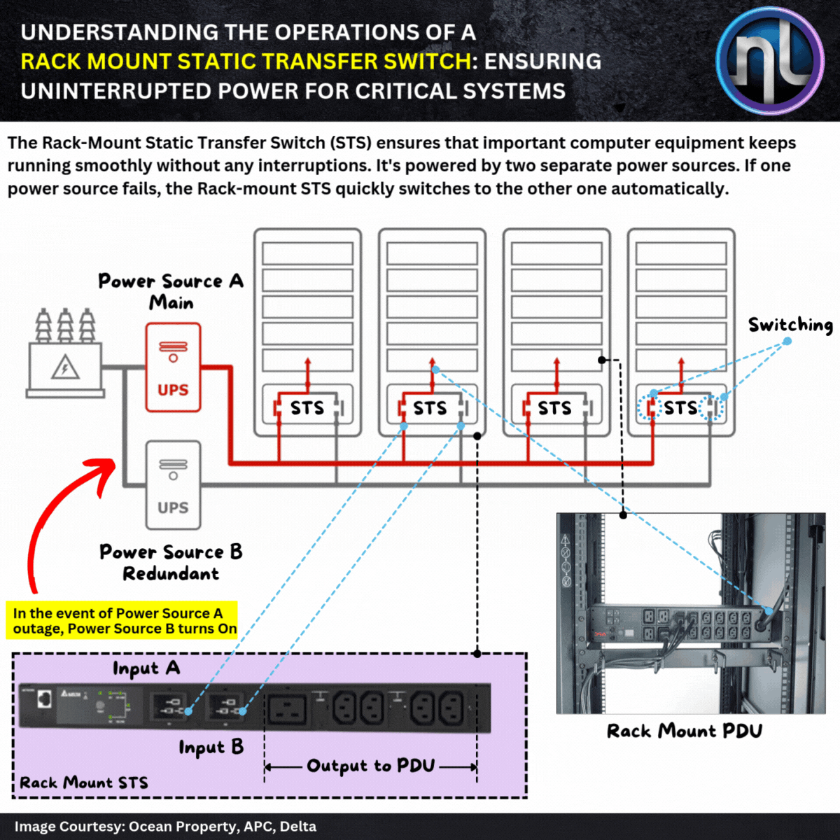 Data Centers | Informative Understanding the Operations of a Rack Mount Static Transfer Switch: Ensuring Uninterrupted Power for Critical Systems Ensuring seamless operations for mission critical IT equipment just got easier. How? Rack-Mount Static Transfer Switch (STS) is your solution. What is a Rack-Mount STS? A Rack-Mount STS connects to two independent power sources and ensures that your equipment stays operational—even if one source fails. The STS automatically and instantly transfers the load to the secondary source, ensuring zero downtime. Why It Matters in Data Centers In data center environments, a Rack-Mount STS adds a layer of rack-level power redundancy. Instead of risking a total system shutdown due to a power drop, the STS localizes power continuity, isolating issues at the rack level. KEY BENEFITS Automatic Source Switching in the event of power failure Redundancy at the Rack Level, reducing single points of failure Seamless Operation for critical IT equipment Increased Reliability in high-availability environments Integrating Rack-Mount Static Transfer Switches into your data center power design is a smart way to future-proof operations and boost uptime—because in mission-critical systems, every second counts.