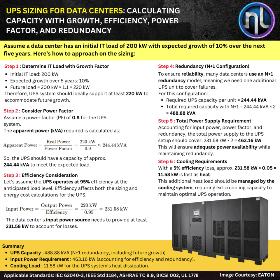 Data Centers | Informative UPS Sizing for Data Centers: Calculating Capacity with Growth, Efficiency, Power Factor, and Redundancy Key factors when selecting a UPS for a data center: Future Load Growth When sizing a UPS for data centers, plan for the next 5–10 years of growth. Allow flexibility by slightly oversizing or using a modular system to expand as needed. Industry best practices suggest running UPS at about 80% capacity to handle peak loads and growth without risking overload or needing an upgrade. Power Factor Correction Needs Correcting the power factor is key for UPS efficiency in data centers, as low power factors can reduce performance. Improving the power factor closer to 1.0 helps the UPS run more effectively. Some UPS systems also reduce electrical noise by compensating for harmonic distortion from non-linear loads, which improves power quality and reliability for critical equipment. Efficiency at Different Load Levels UPS systems operate at different efficiencies based on the load level, typically reaching peak efficiency between 30-90% load. Reviewing a UPS’s efficiency curve can help you select the best load range for your data center, optimizing energy use and costs. Some UPS systems also offer energy-saving modes, like “eco-mode,” which can bypass double conversion when the incoming power quality is stable, increasing efficiency. However, this mode should be used with care, as it may reduce protection in some configurations. Scalability and Redundancy Needs To ensure reliability, data centers often use redundant UPS setups like N+1 or 2N. N+1 means having one extra UPS unit as a backup, while 2N doubles the total capacity, providing even more backup. Modular UPS systems are another great option, as they let you increase power capacity easily as the data center’s needs grow, providing flexibility and scalability. Environmental Conditions and Cooling Load UPS systems produce a lot of heat, especially larger ones, so it’s important to calculate the extra cooling required to keep them from overheating. High temperatures can also shorten battery life, so it’s best to place UPS systems in climate-controlled areas. When designing HVAC systems, consider the additional heat load from the UPS to ensure batteries and equipment stay at optimal temperatures, extending their lifespan. Assume a data center has an initial IT load of 200 kW with expected growth of 10% over the next five years. Here’s how to approach on the sizing: Step 1 : Determine IT Load with Growth FactorStep 2 : Consider Power FactorStep 3 : Efficiency ConsiderationStep 4: Redundancy (N+1 Configuration)Step 5 : Total Power Supply RequirementStep 6 : Cooling Requirements