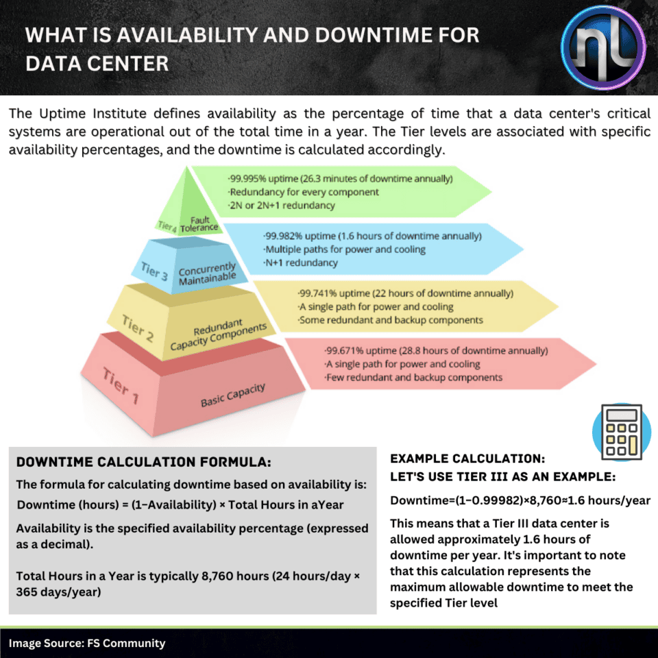 Data Centers | Informative What is Availability and Downtime in a Data Center? In today’s digital economy, uptime is everything. Whether you’re running cloud services, enterprise networks, or mission-critical applications, understanding availability and downtime is fundamental to designing, building, and maintaining a reliable data center. What is Availability? Availability refers to the percentage of time a data center or system remains operational and accessible. It’s a direct measure of reliability and service continuity. Availability is typically expressed as a percentage over a defined period—usually a year. Higher availability = Lower risk of service interruption What is Downtime? Downtime is the total period of time a system is not operational or fails to perform its intended function. This includes planned maintenance, unexpected failures, or external disruptions. Downtime is critical because: It impacts business operations, user experience, and revenue. It’s often used as a metric in Service Level Agreements (SLAs). It can be costly : Even a few minutes of downtime can result in significant financial loss for large enterprises. Uptime Tiers and Benchmarks Data center Tier Standards (I to IV), defined by the Uptime Institute, provide a framework for availability expectations: Tier I: ~99.67% uptime Tier II: ~99.75% uptime Tier III: ~99.98% uptime Tier IV: ~99.995% uptime Key Factors Influencing Availability and Downtime Power Redundancy – UPS systems, backup generators, and microgrids minimize power-related disruptions. Network Resilience – Dual-homed connections and failover systems ensure continued data traffic. Cooling Efficiency – Thermal management keeps equipment in optimal condition. Security Systems – Physical and cyber security measures protect availability from malicious attacks. Maintenance Practices – Predictive maintenance and real-time monitoring reduce unexpected downtime. Why It Matters For businesses relying on uninterrupted digital operations, even minor downtime can be disruptive. Availability and downtime metrics help guide infrastructure decisions, inform service-level expectations, and ultimately ensure that data centers are built to support today’s 24/7 demands. At Northern Link, we help our partners design and implement data center solutions that prioritize high availability, resilience, and operational excellence.